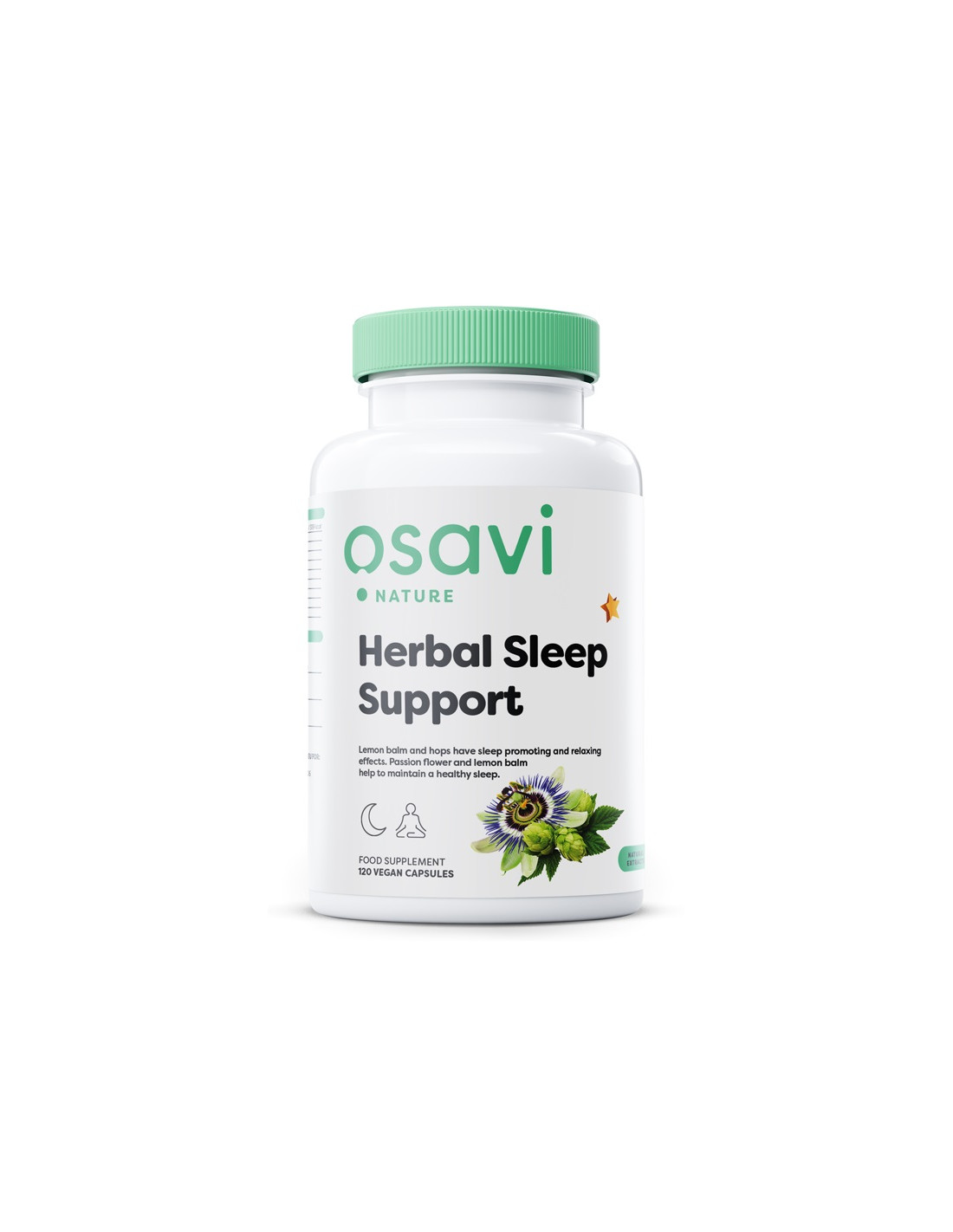 Veganistische capsules met gestandaardiseerde extracten van passiebloem ( Passiflora incarnata ), hop ( Humulus lupulus ) en citroenmelisse ( Melissa officinalis ). Elke capsule bevat een uitgebalanceerde botanische mix, geverifieerd op het officiële Osavi-productlabel.