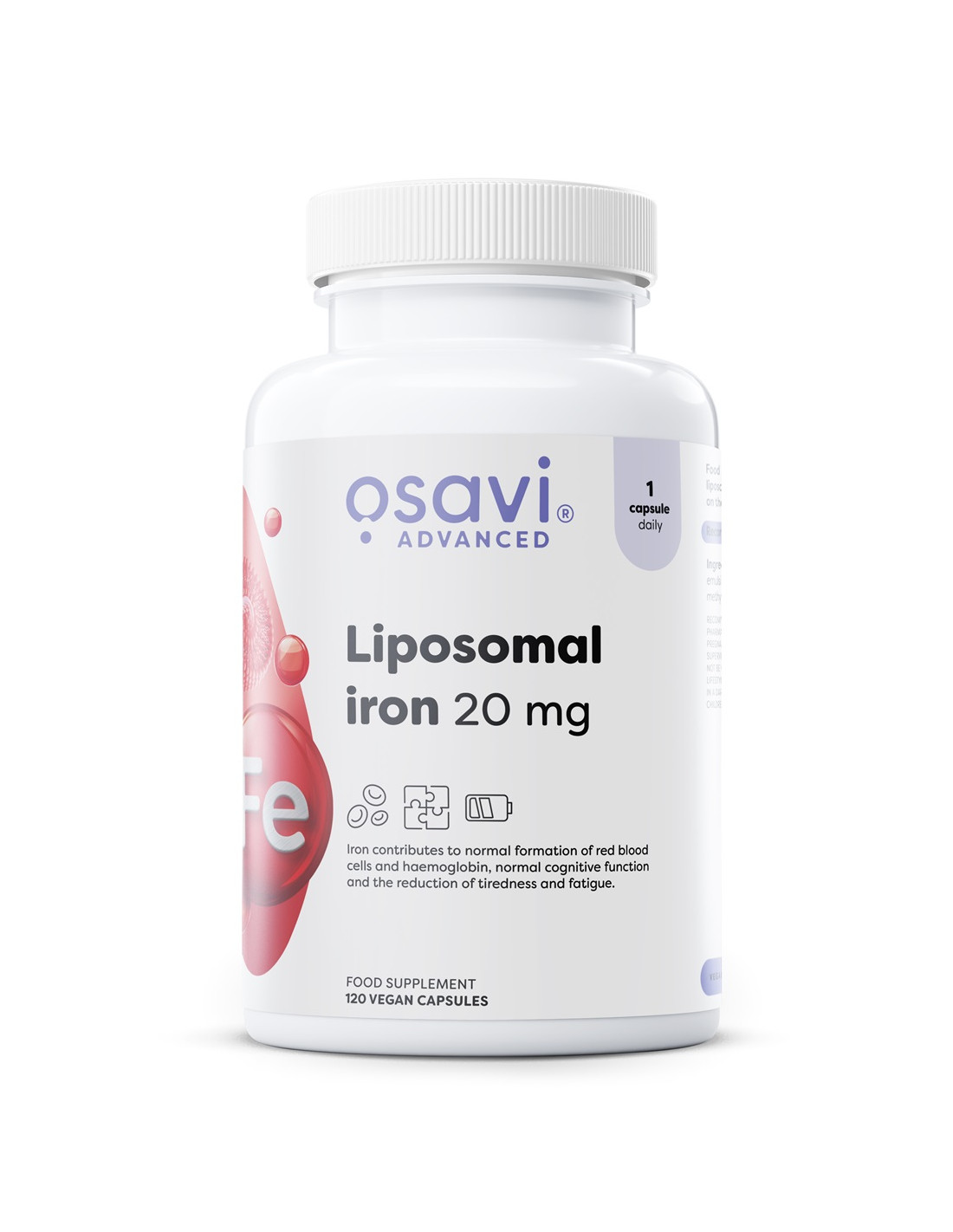 Osavi Liposomaal IJzer levert 20 mg ijzer per capsule in een geavanceerde liposomale vorm, Liposovit®-Fe, die de biologische beschikbaarheid en absorptie verbetert en tegelijkertijd mild is voor het spijsverteringsstelsel. IJzer draagt bij aan een normaal zuurstoftransport in het lichaam, de vermindering van vermoeidheid en moeheid, en de normale vorming van rode bloedcellen en hemoglobine (zoals goedgekeurd door de EFSA).