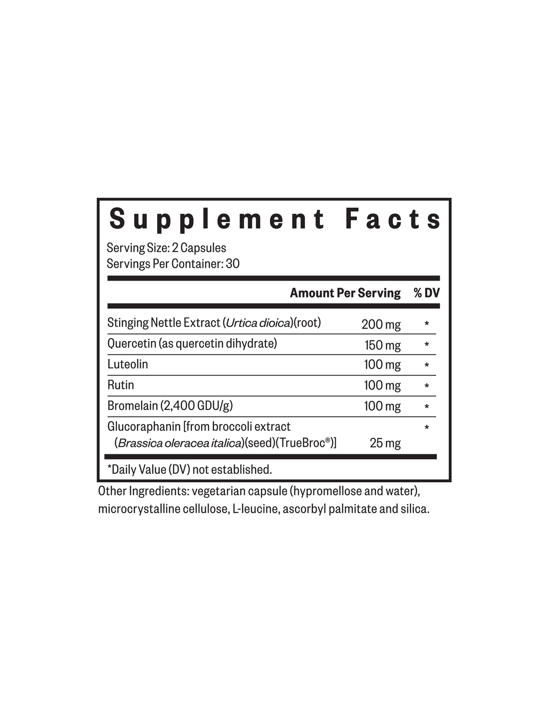 Vegetarische capsule (hypromellose en water), microkristallijne cellulose, L-leucine, ascorbylpalmitaat, silica, brandnetelextract (Urtica dioica) (wortel), quercetine (als quercetinedihydraat), luteoline, rutine, bromelaïne (2400 GDU/g), glucorafanine (uit broccoli-extract) (TrueBroc®).